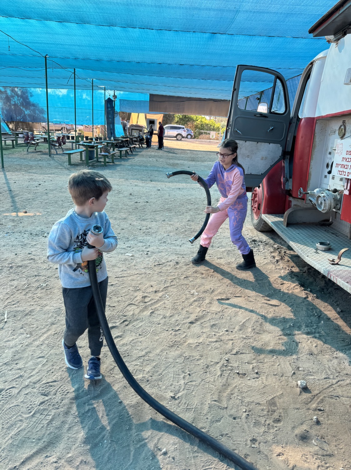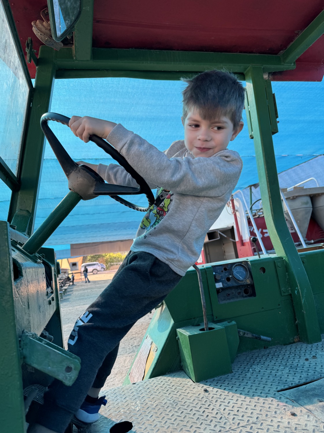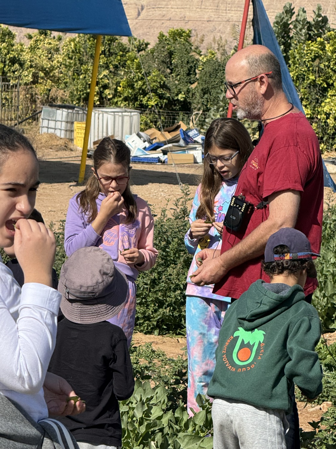 В Шабат, пока Егор работал в морском центре, мы с детьми отправились в соседний кибуц на ежегодное мероприятие «5 чувств». Там можно было осязать, слушать, пробовать, видеть и обонять: теплицы с помидорками, приготовление овощей в солнечной печке, знакомство с местными травами — и, конечно, возможность полазать на тракторе и пожарной машине. День выдался по-настоящему солнечным.